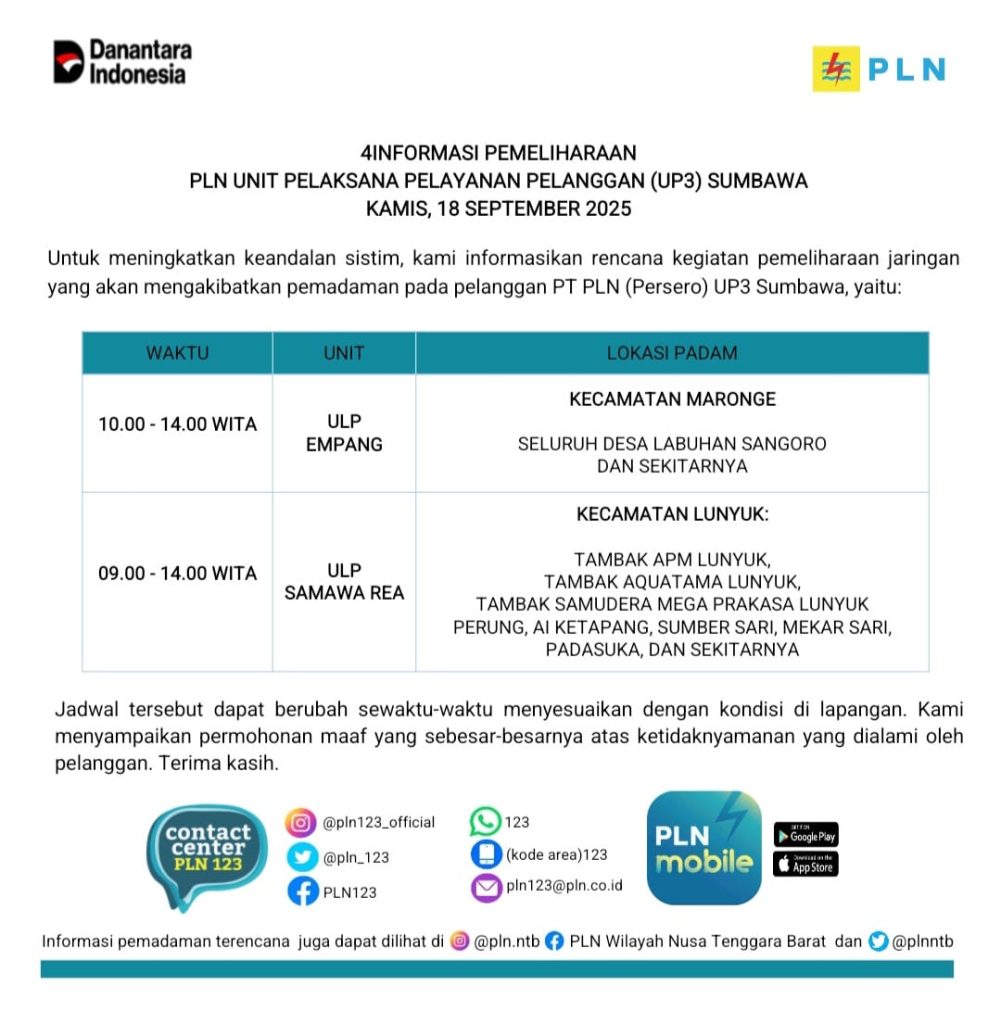 Nusa Tenggara Barat Sosial Sumbawa Informasi Pemeliharaan UP3 Sumbawa. Kamis 18 September 2025 samanta news September 17, 2025 Samantanews.com Post navigation Previous: Tapak Suci Turunkan Atlit Cadangan di Porkab 2025, Hasilnya MemukauNext: Perolehan Sementara Medali Porkab Sumbawa 2025 Leave a Reply Cancel replyYour email address will not be published. Required fields are marked *Comment * Name * Email * Website Save my name, email, and website in this browser for the next time I comment. Δ Related News Daerah Pemerintah Sumbawa Safari Hijau di Liang Petang, Wabup Sumbawa Tanam 1.200 Pohon Bersama Warga Batu Tering samanta news January 11, 2026 0 Daerah Organisasi Pemerintah Sumbawa Safari Sumbawa Menanam Putaran IV, Pemkab Tanam Ribuan Kemiri di Lenangguar samanta news December 29, 2025 0 Organisasi Pemerintah Sumbawa Pemdes Kerato Siapkan Program Penghijauan di Ai Beta, Libatkan Multi Pihak samanta news December 10, 2025 0