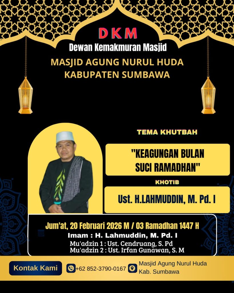 Khotib: Ustadz H. Lahmuddin, S.Ag., M.Pd.I (Imam Masjid Agung Nurul Huda dan PNS Lingkup kementerian Agama Kab. Sumbawa)